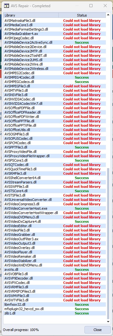 Then please completely reinstall AVS4YOU using the previous instruction. AVS4YOU will automatically install new VCRedist 2015-2019 version 14.27.29114, which contains all the required libraries. Repeat the Repairing process. This should resolve the error. Here is the instruction for uninstalling:
